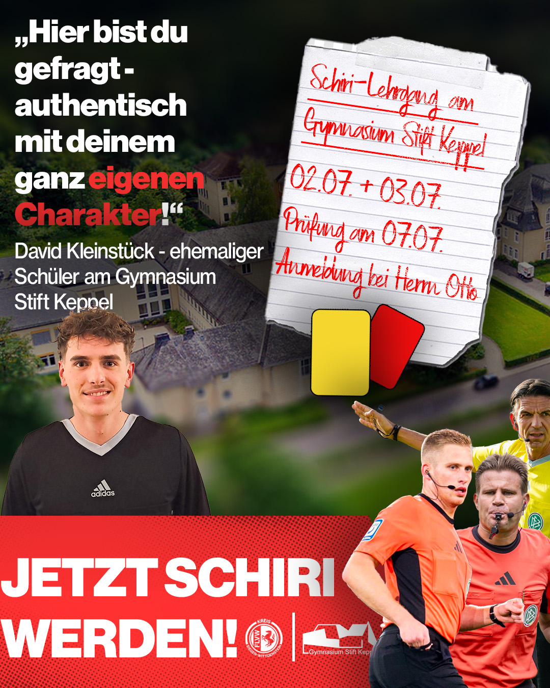 Am Ende des Schuljahres 2024/ 2025 ist es gelungen, für interessierte Schülerinnen und Schüler einen Schiedsrichterlehrgang zu organisieren. Über unseren Alumni David Kleinstück konnte der Kontakt zum FLVW hergestellt werden. Bereits am 20.05. fand eine Informationsveranstaltung statt, in der Herr Kornmann und Herr Neus den Schülerinnen den möglichen Werdegang und vor allem die Vorteile (u.a. für die Persönlichkeitsentwicklung) aufzeigten. Das Interesse, an dem Kurs teilzunehmen, war danach so groß, dass sich alle Schüler, die an der Veranstaltung teilnahmen, für den Kurs anmeldeten. Die Möglichkeit der Anmeldung besteht allerdings auch, ohne an der Infoveranstaltung teilgenommen zu haben, weiterhin. Der Kurs findet am 02.07., 03.07. und 07.07. im Gebäude des Stifts statt.
